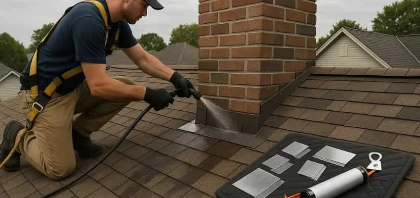 We examine crown slope, cap fit, mortar joints, brick or stone surfaces, and flashing transitions at the roofline. In Holly Park, King this area is often the origin of leaks.